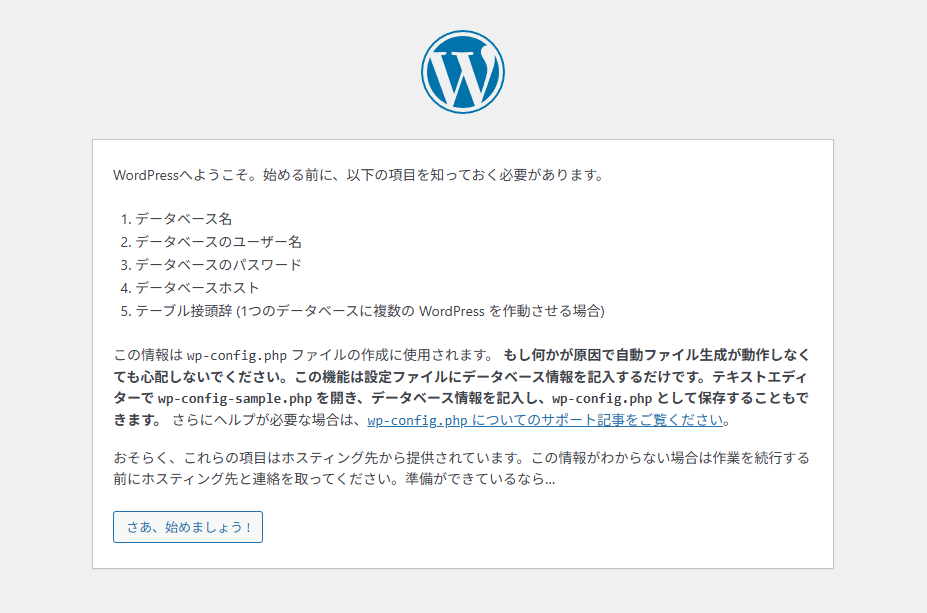 通常なら、ここから「さあ始めましょう」ボタンで必要情報を入れればwp-config.phpが作られる。