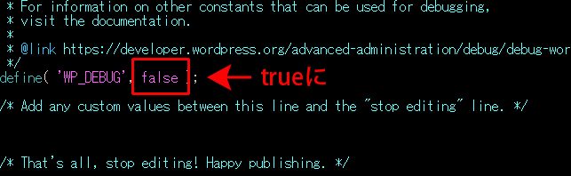wp-config.phpのdefine( ‘WP_DEBUG’, false );をdefine( ‘WP_DEBUG’, true );に変更してエラーを画面に表示させる。