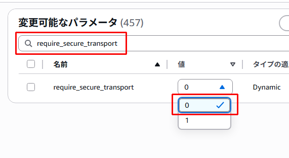 検索に設定パラメータ「require_secure_transport」を入れる。