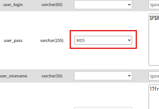 user_pass の値を「MD5」で暗号化した新しいパスワードに変更